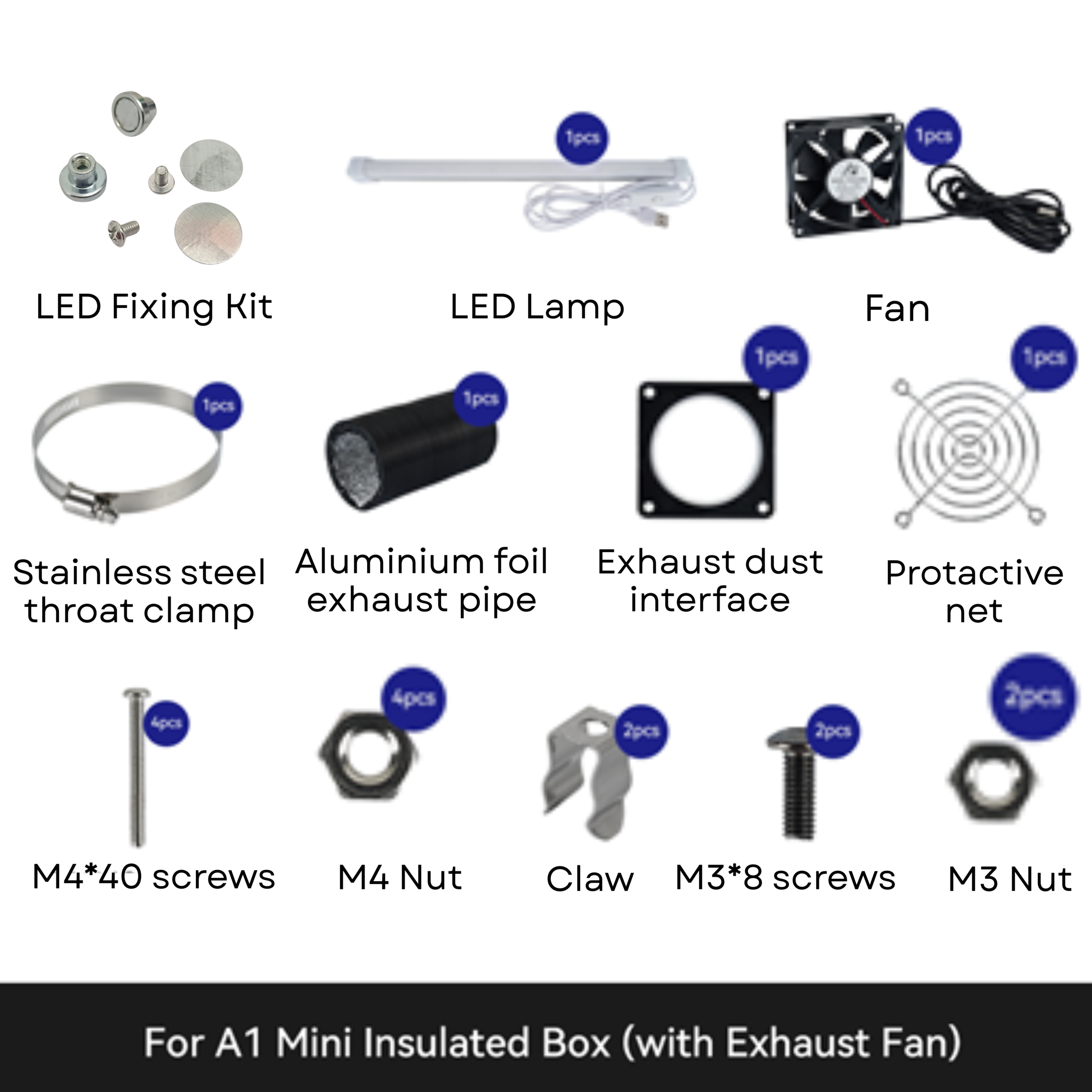 With a user-friendly design, the Bambu Lab Enclosure for A1 Mini with Exhaust Fan is simple to assemble and comes with all essential accessories — including an exhaust duct interface, protective net, temperature and humidity meter, LED lamp, and durable connectors. The result is a professional-grade enclosure that enhances both performance and usability.