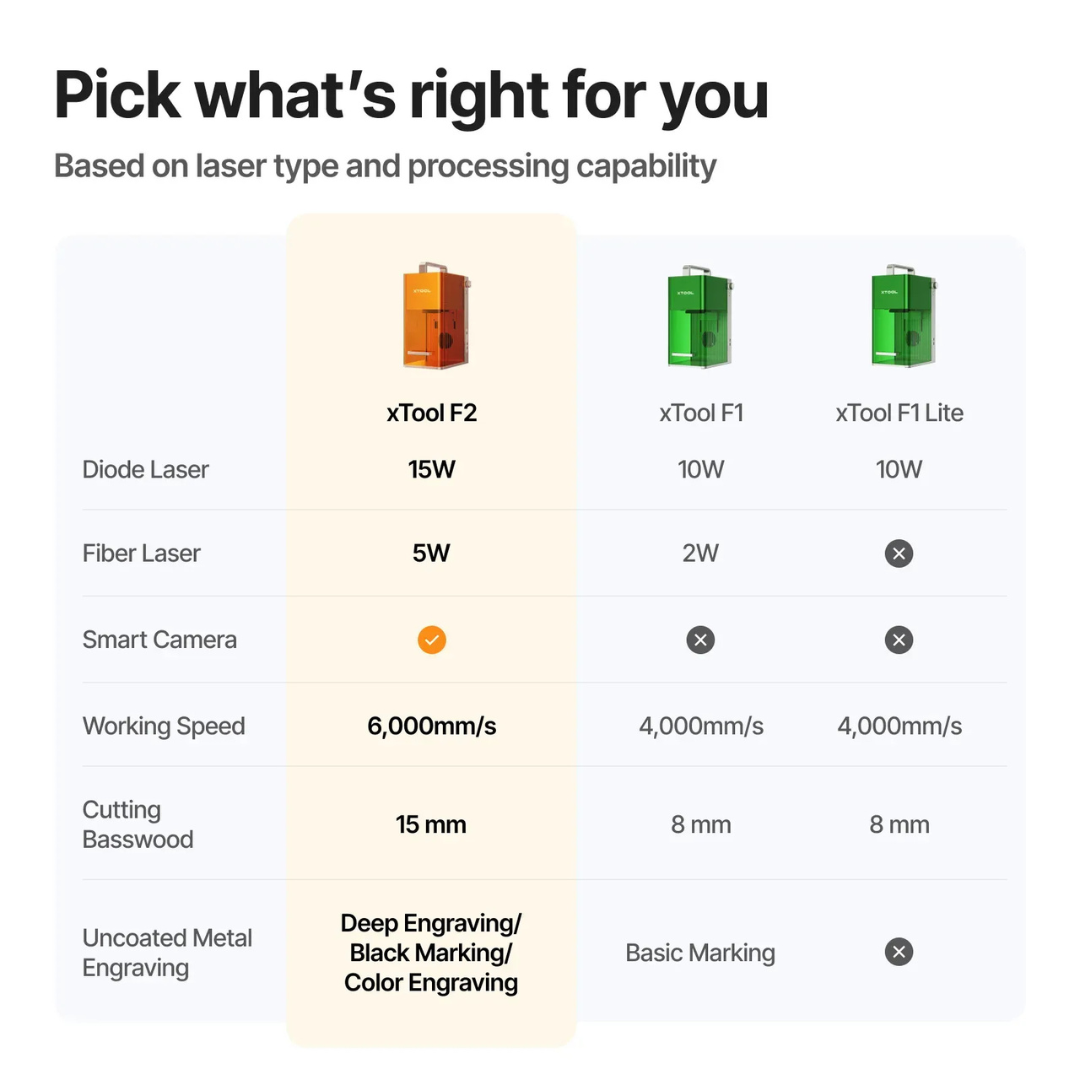 | Feature | xTool F2 | xTool F1 | xTool D1 Pro |