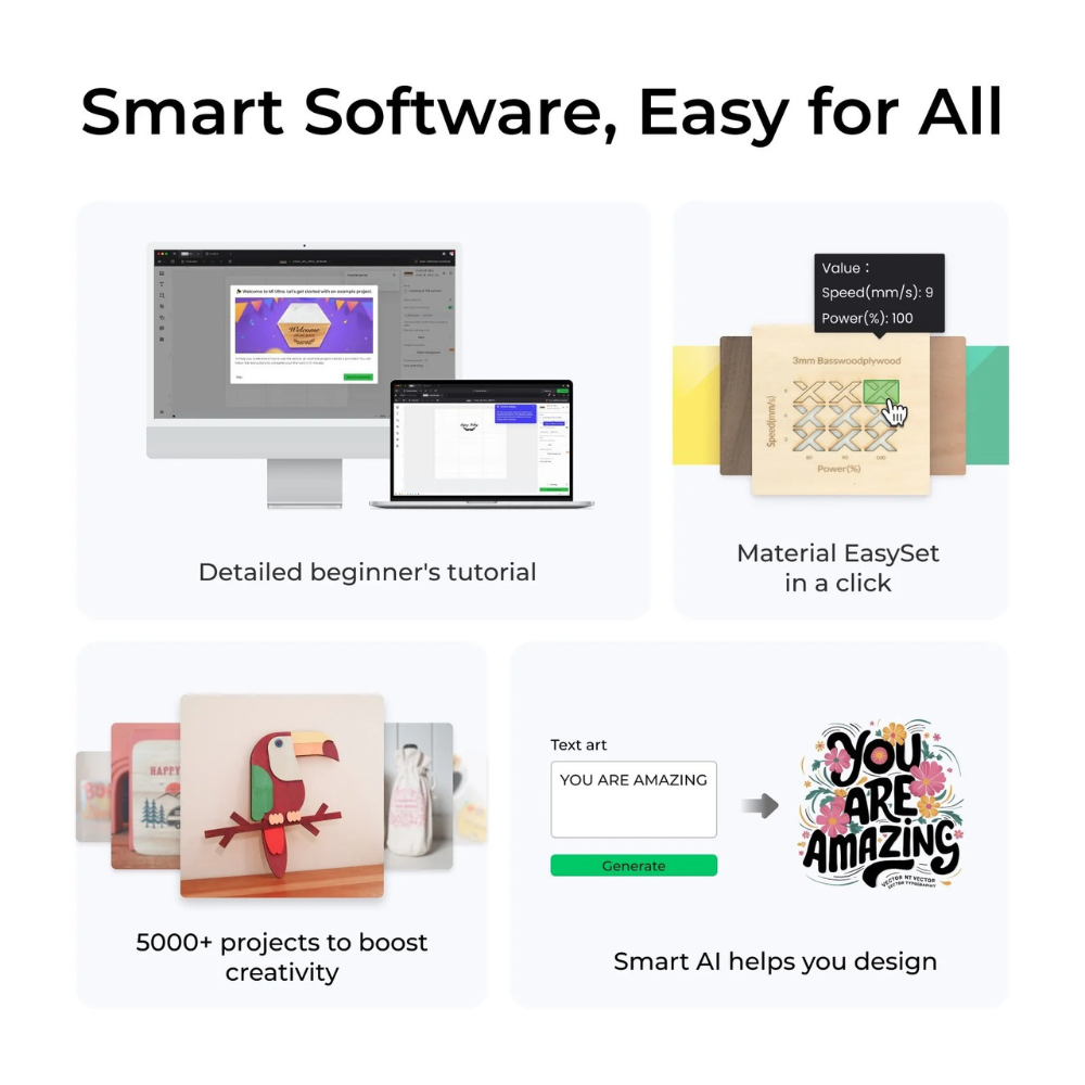 The high-power laser system ensures clean edges, detailed engraving, and consistent performance for professional craft projects.