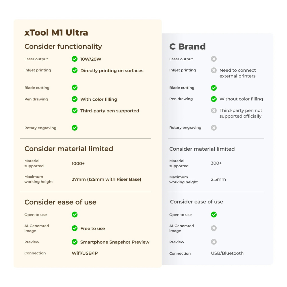 Whether you are producing custom merchandise, personalized gifts, business packaging, or creative DIY crafts, the xTool M1 Ultra 20W Premium Edition provides the flexibility and precision required for professional-quality results.